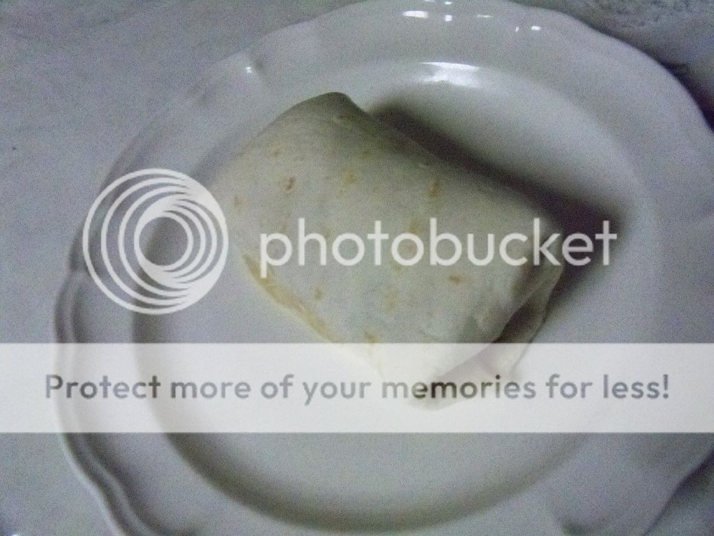 | This is my attempt to roll it into a burrito like shape. I tried to warm the tortilla a bit first to make it easier to work with, but I think I wound up cooking it at too hot of a temperature or too long or something. | |