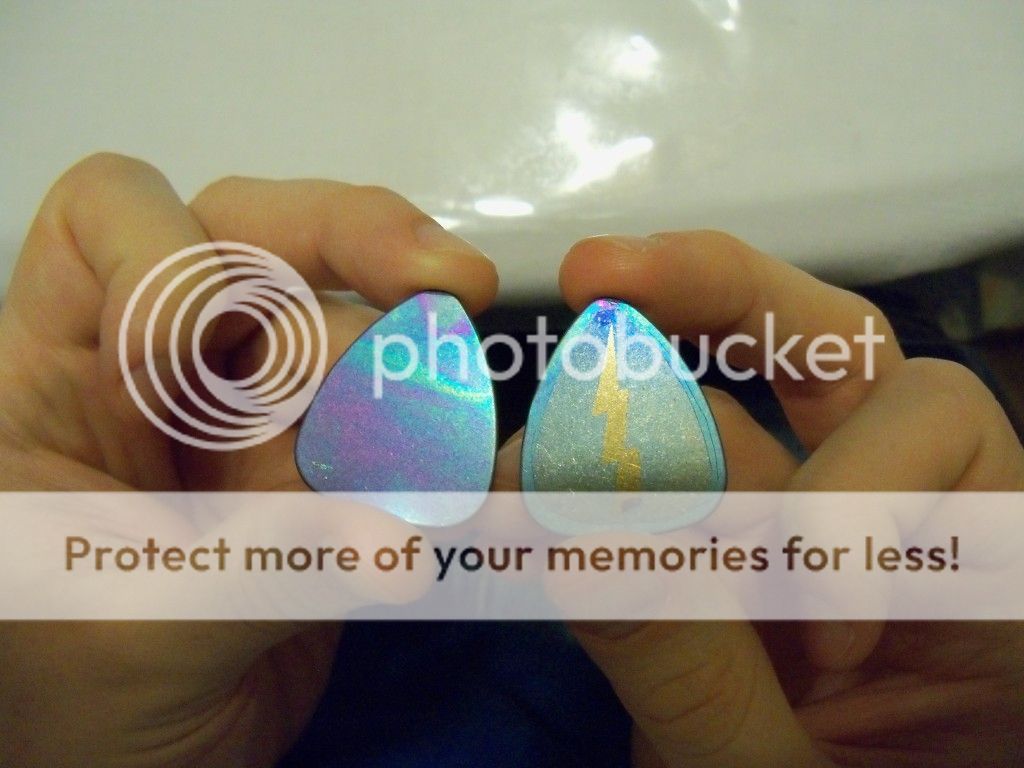 ![]() | Another picture of the titanium picks my boyfriend and I anodized. I think they turned out pretty cool. |